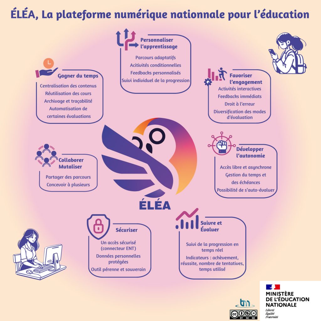 L’infographie présente Éléa, la plateforme numérique nationale dédiée à l’éducation, en mettant en avant ses principaux avantages et fonctionnalités, structurés en six thématiques.